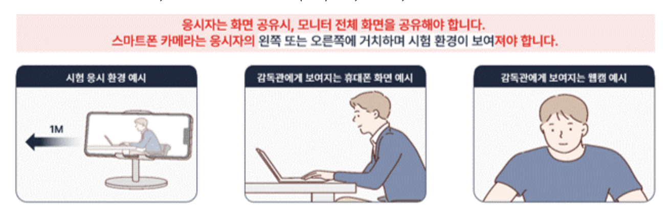 - 휴대폰카메라는 수험자의 양손, 얼굴 측면, 책상위, 모니터가 보이도록 각도 설정 필수