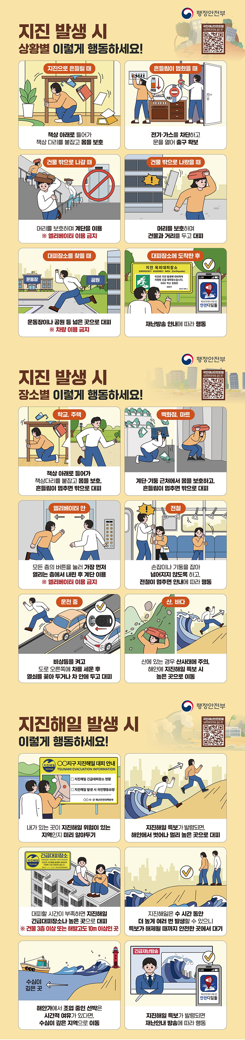 - 백화점, 마트의 경우 계단/기둥 근처에서 몸을 보호하고 흔들림이 멈추면 밖으로 대피합니다.