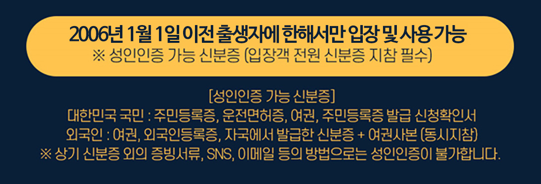 - 2006년 1월 1일 이전 출생자에 한해서만 입장 및 사용가능합니다.